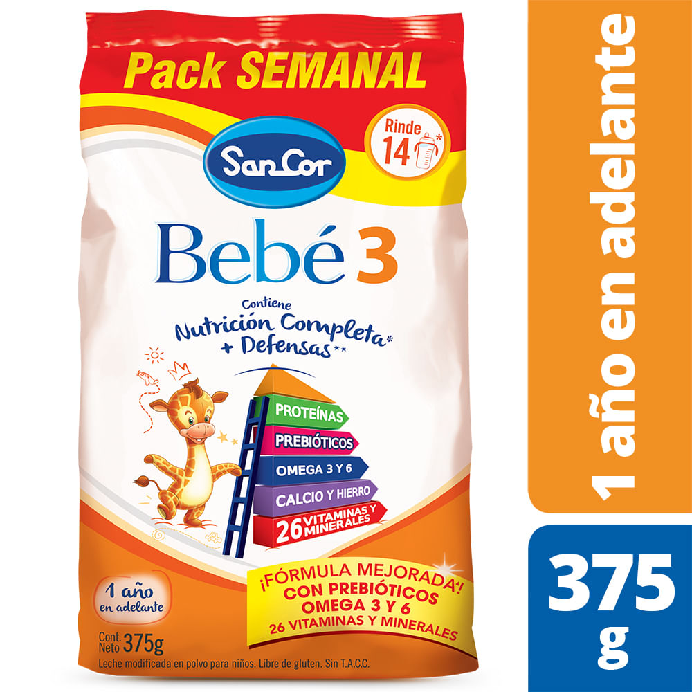 SanCor Bebé 3 301,849 likes 198 talking about this ¿Qué tiene SanCor Bebé 3?Leche Infantil Líquida Sancor Bebé 3 Sabor Original 1 a 3 Años x 0 ml x 30 un $ 2614,00 $ 2614,00 Comprar Muestra Gratis Muestra Gratis Leche Infantil Líquida Sancor Bebé 3 Sabor Original 1 a 3 Años x 0 ml x 30 un Producto no disponible, solo a base de muestra EXO_40off_INDIVIDUAL_14 40%Vitamina E 07 mg;